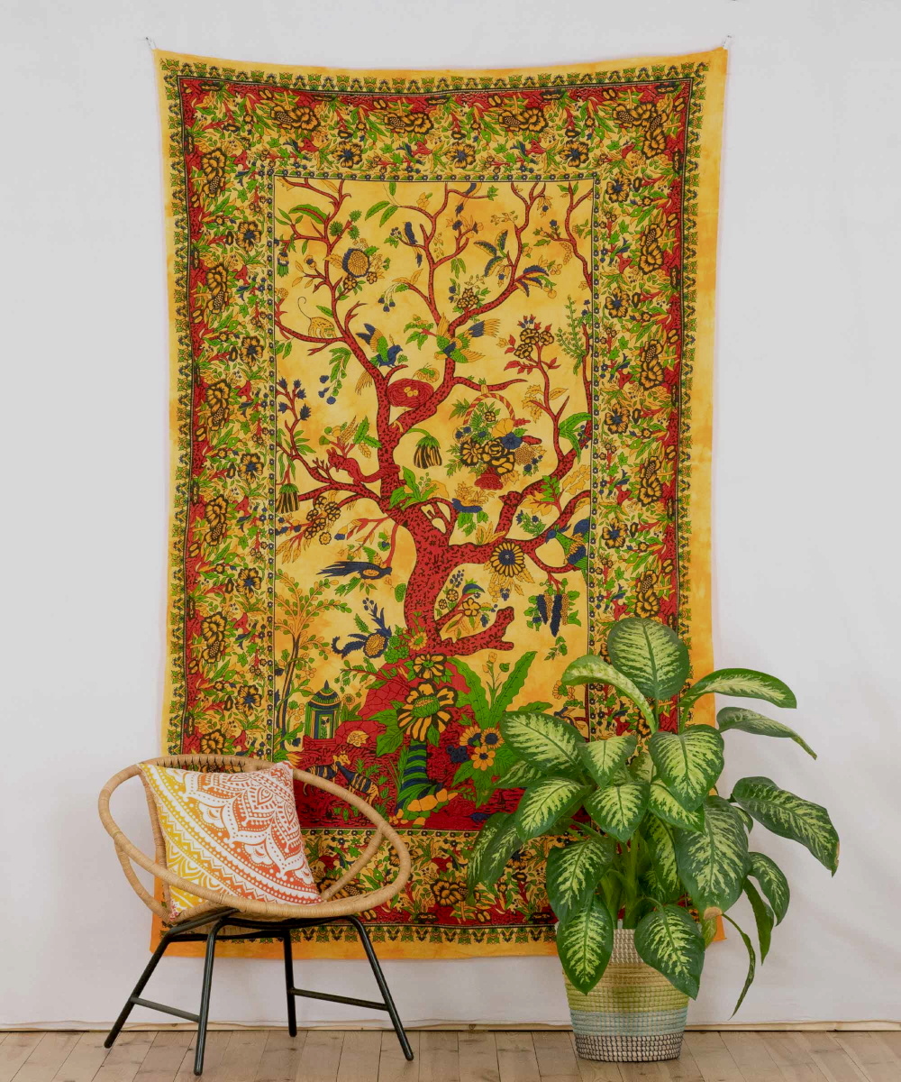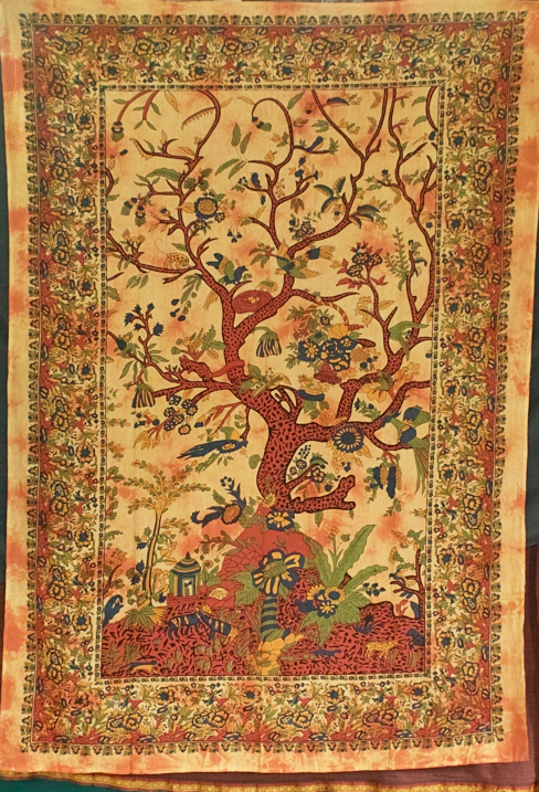 Der Lebensbaum als Symbol für das Zentrum der Welt ist in den verschiedensten Kulturen bekannt. Der Baum wurzelt tief in der Erde, streckt seine Krone weit in den Himmel - und verbindet Unter- und Oberwelt, die Erde und den Himmel - ein altes Symbol der kosmischen Ordnung. Er versinnbildlicht den ewigen Kreislauf des Lebens. Auf diesem Wandbehang ist der Baum in lebendigen Farben dargestellt und mit spielerischen Ornamenten versehen.