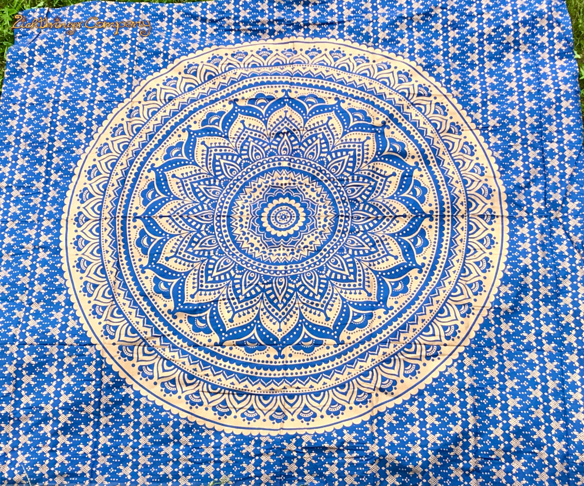 Dieses strahlende, mit goldener Farbe gedruckte Mandala auf dunkelblauem Tuch wirkt durch die... mehr