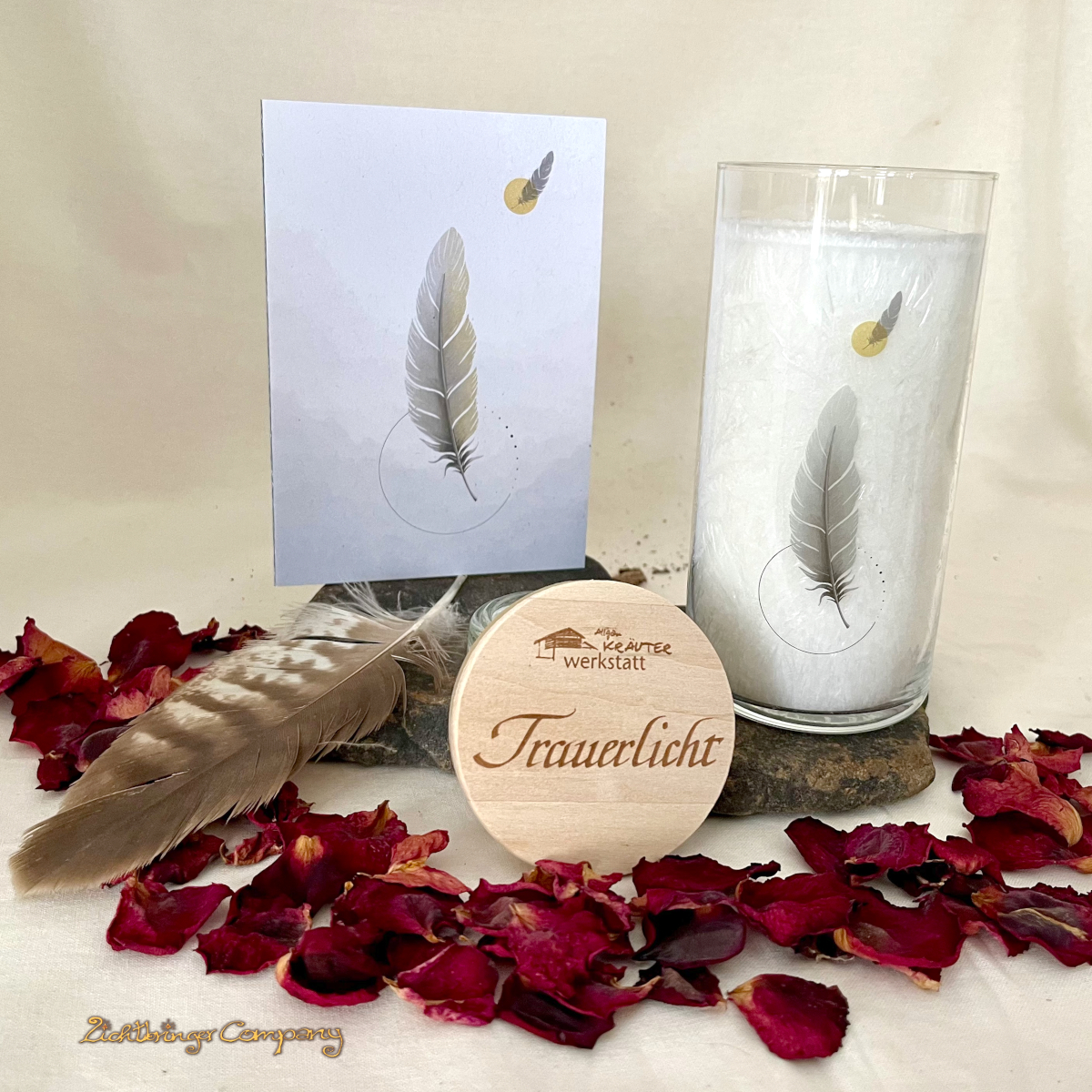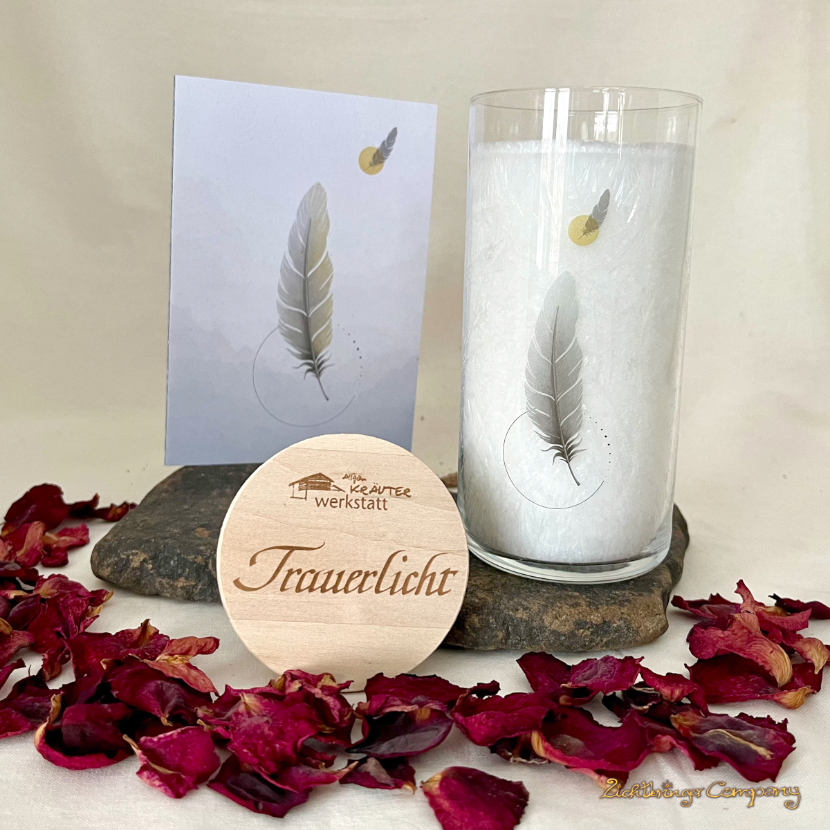 Das Trauerlicht wird mit einer schön gestalteten Karte geliefert. Auf der linken Innenseite ist folgender Text gedruckt: In tiefer Verbundenheit. Auf der anderen Seite gibt es Raum für eigene Worte.