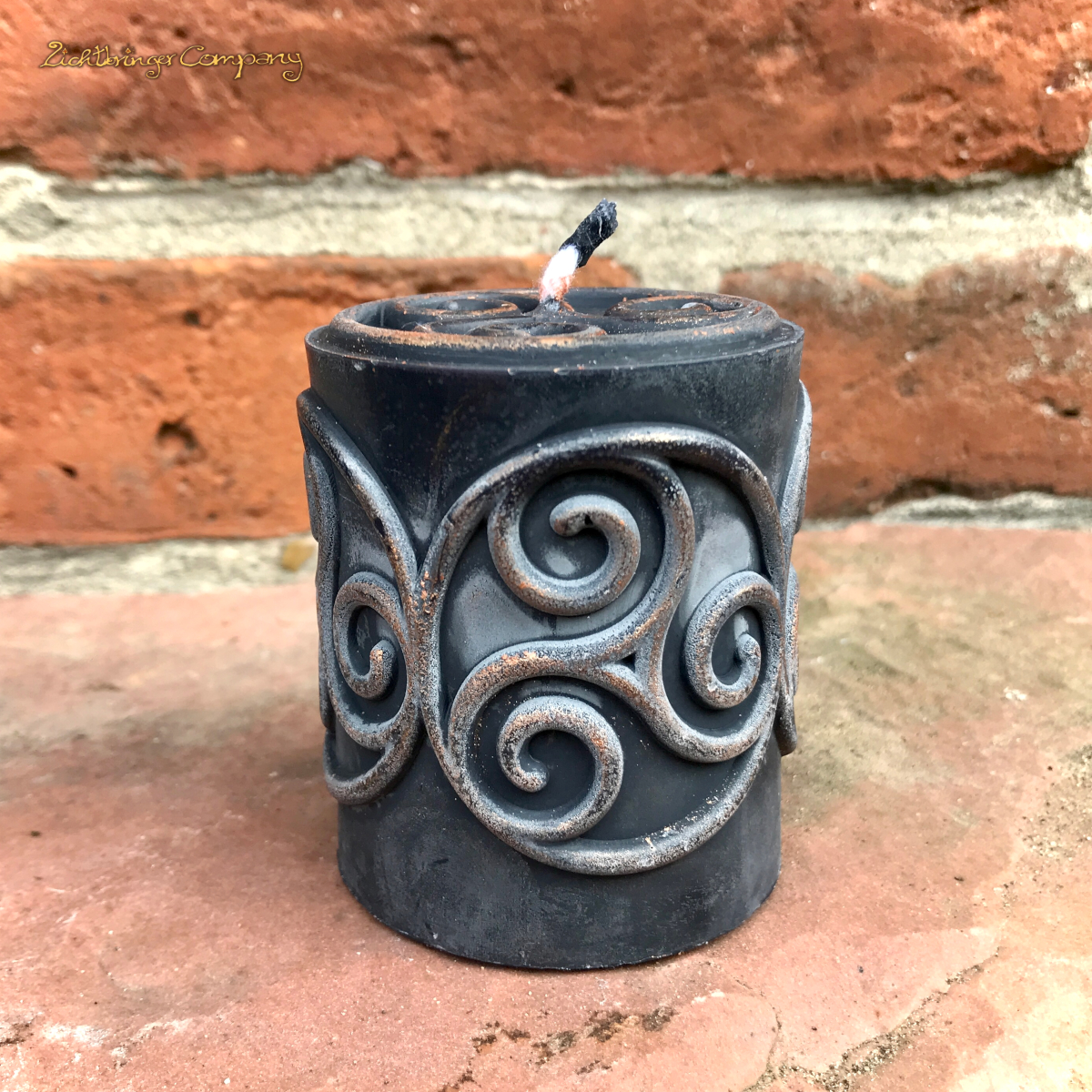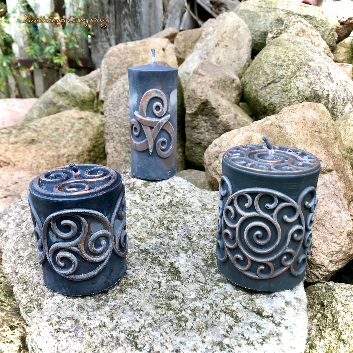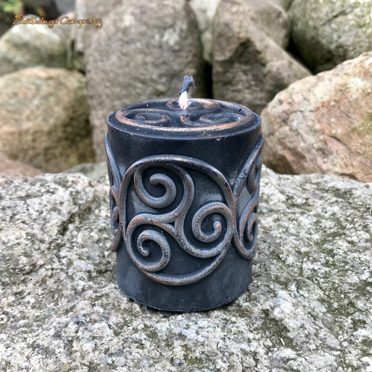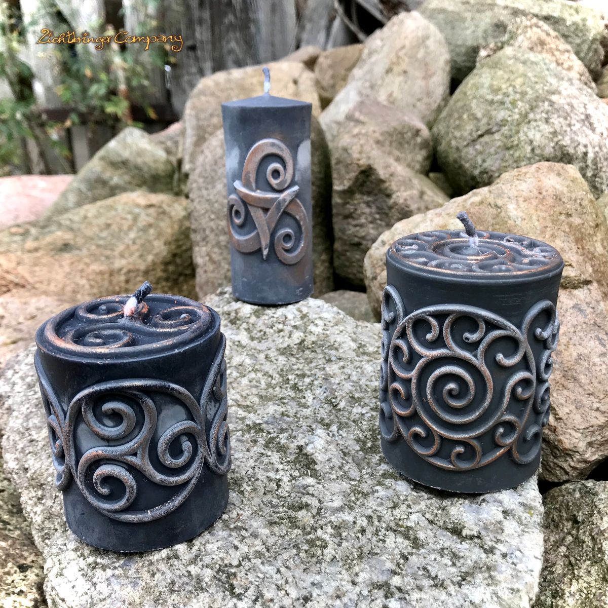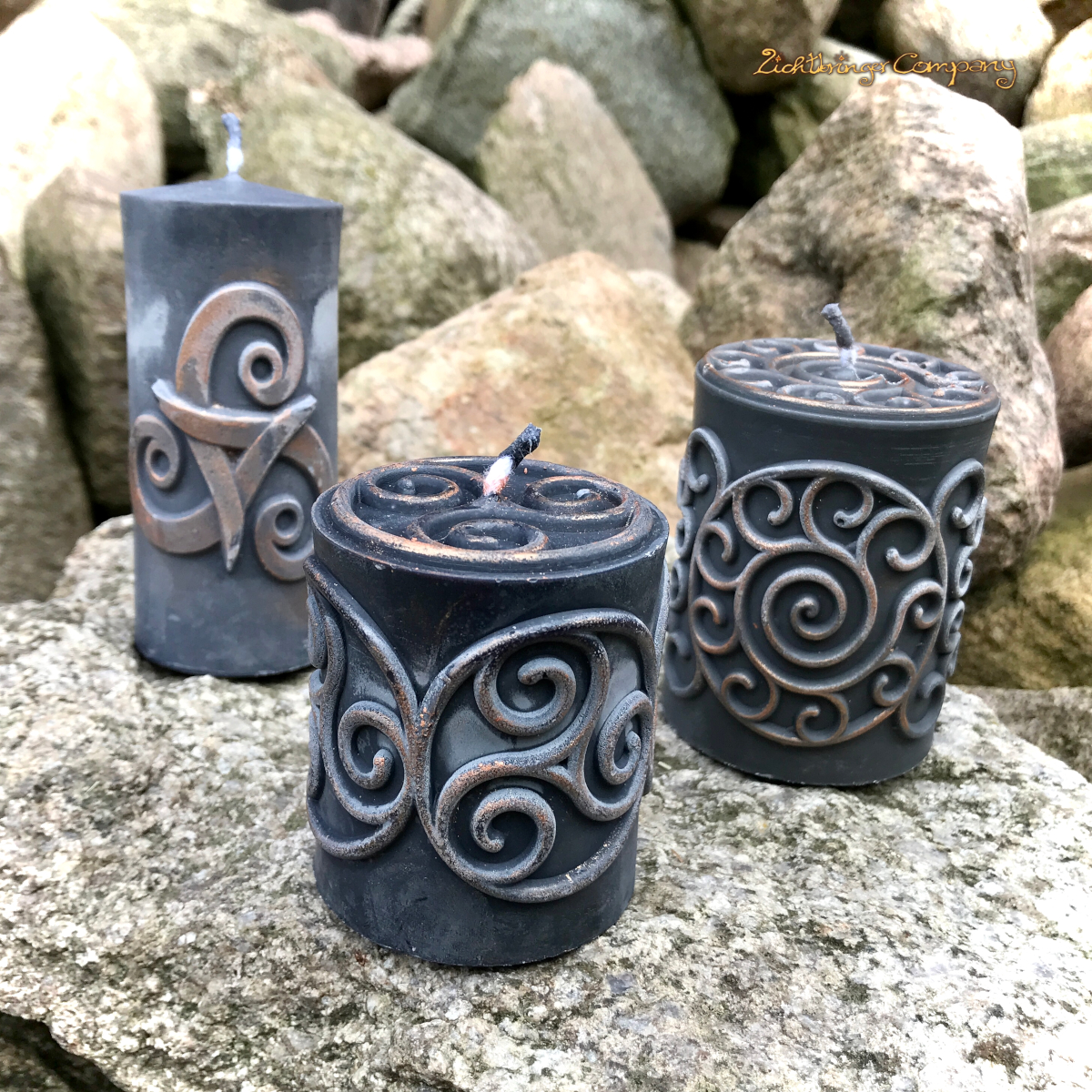 Besondere Kerzen mit keltischen Symbolen: die schwarzgrauen Stumpenkerzen aus Rapswachs werden in unserer Manufaktur handgefertigt und von uns mit feinem natürlichen Kupferglanz veredelt. So kommen Triskele und Spirale besonders gut zum Leuchten. Das sind extravagante Geschenke, oder auch Ritualkerzen für deinen eigenen ganz besonderen Moment.