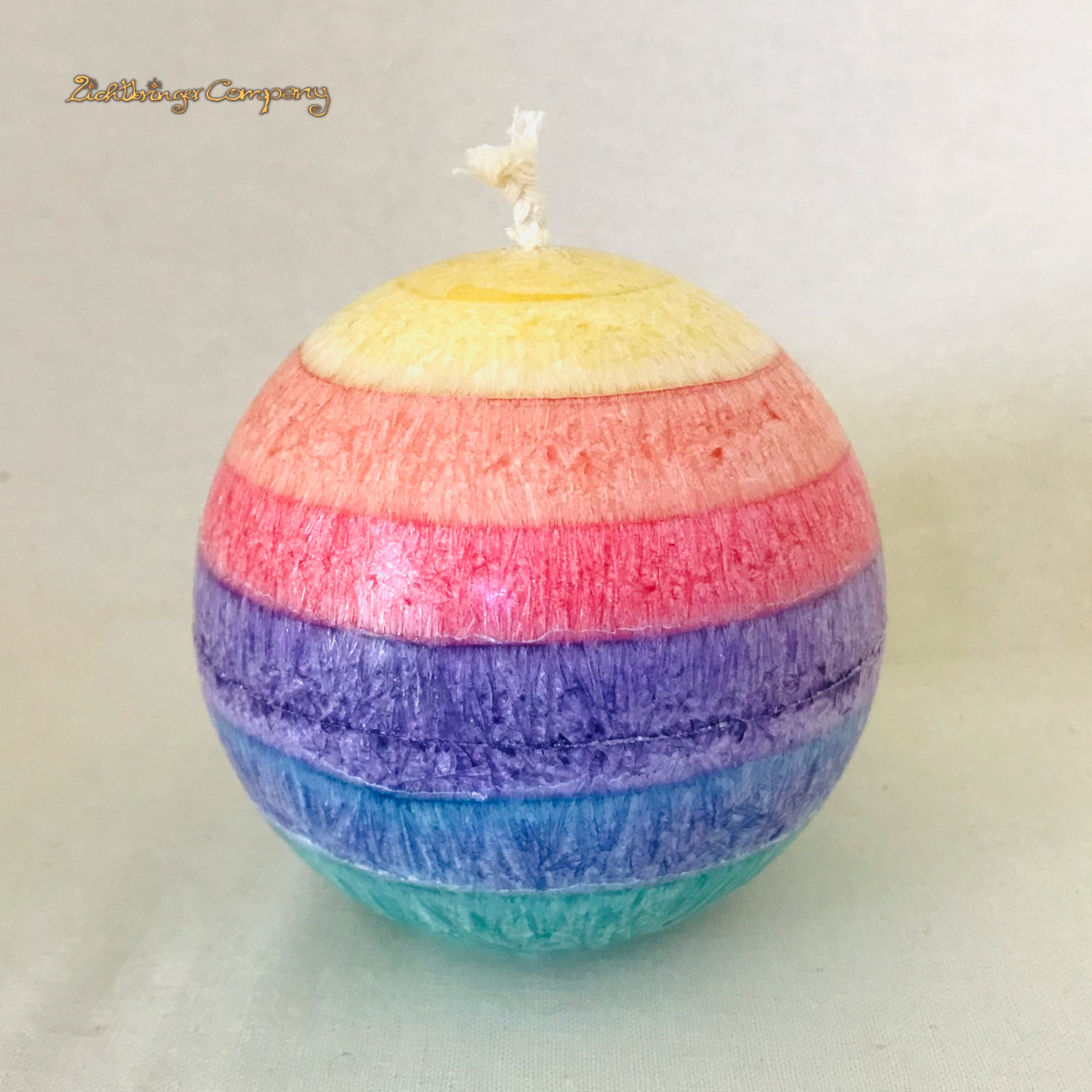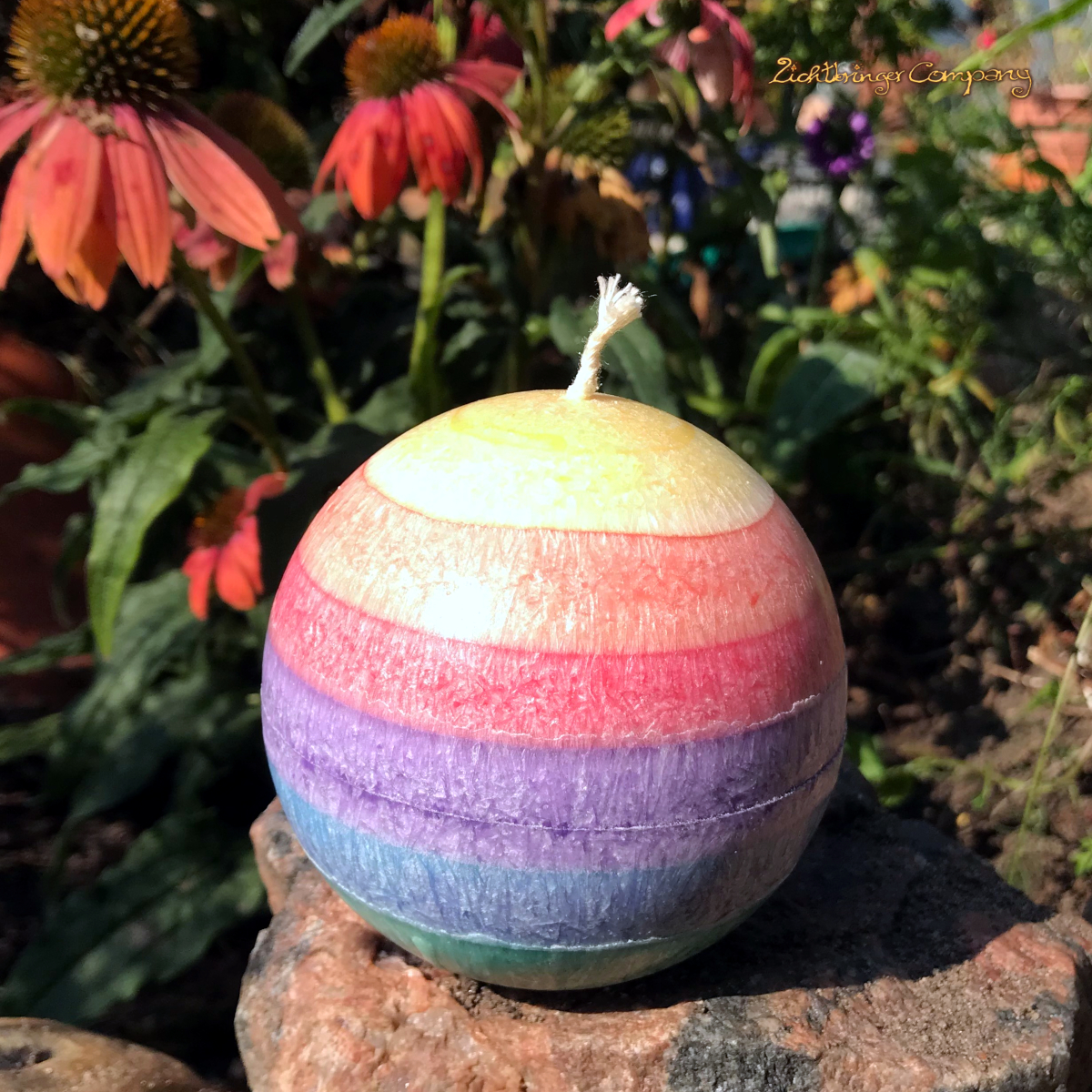 Diese bunte Regenbogenkerze in Kugelform sieht schön aus, brennt sauber ab und duftet sanft aromatisch - jede Farbe setzt einen anderen Duft frei. Laß dich überraschen!