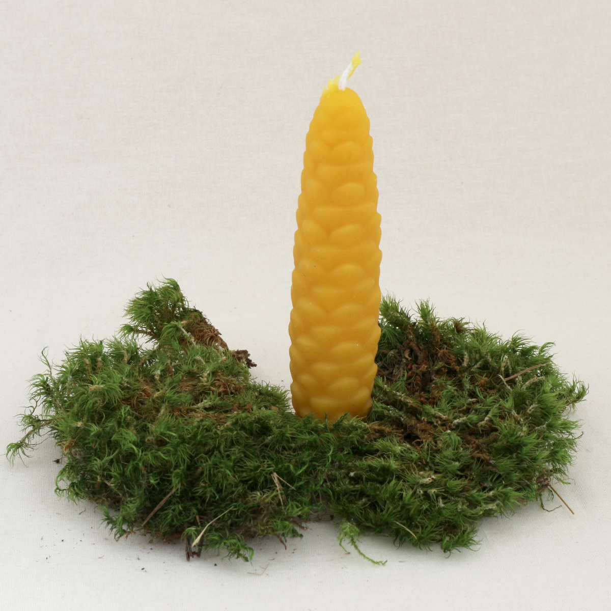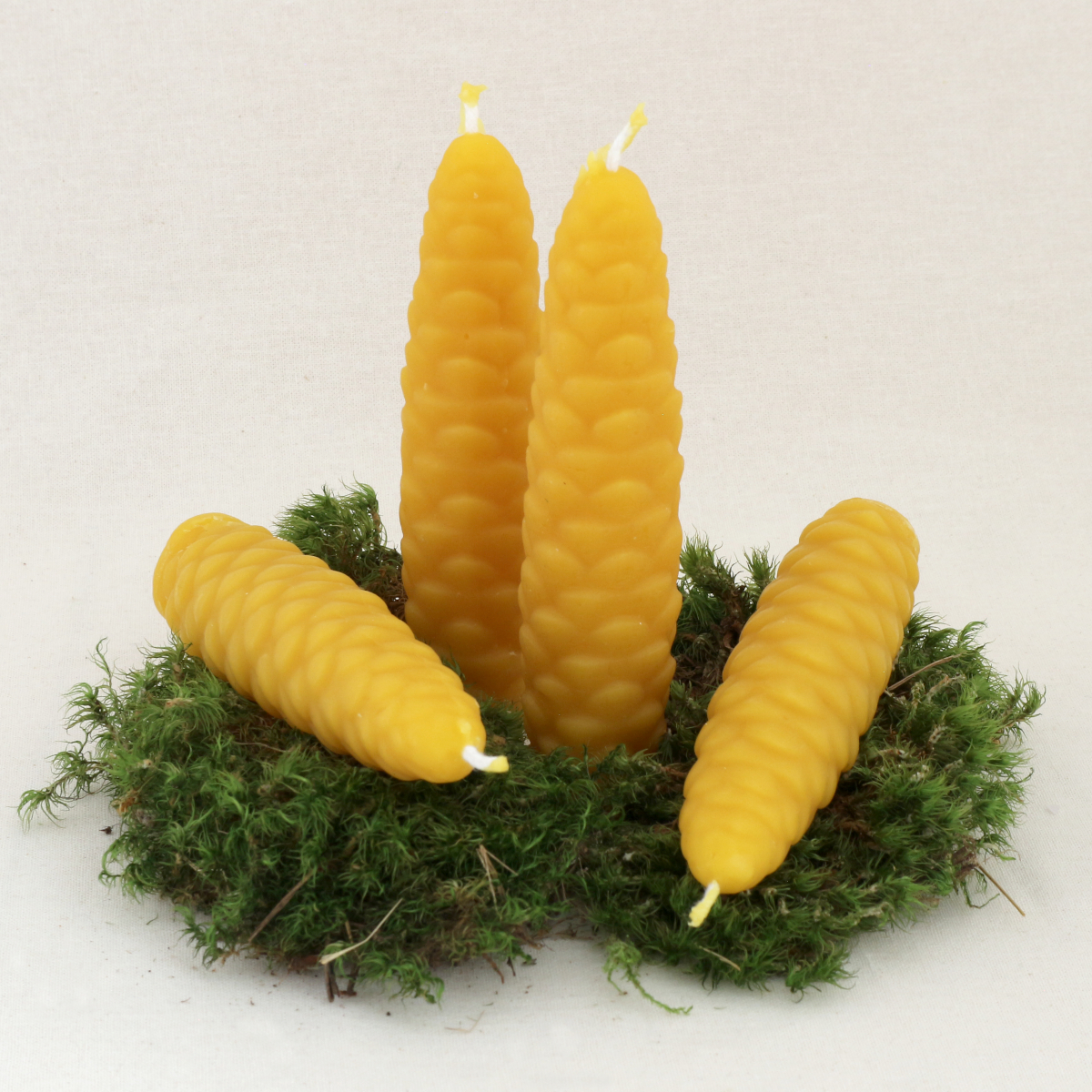 Diese Tannenzapfenkerzen aus 100 % Bienenwachs machen eine schöne Weihnachtsdekoration und beim Abbrennen den typisch feinen, honigwarmen Bienenwachsduft. Das 4er Set eignet sich sehr gut für den Adventskranz. Ebenso könnte man die Tannenzapfen mit passendem Untersatz als etwas dickere Baumkerzen verwenden. Die Kerzen werden in unserer Manufaktur von Hand gegossen und handwerklich bearbeitet. Wir verwenden ausschließlich Bienenwachs aus deutschem Imkerkreislauf, für das Bienenwohl und um die Imkerei als traditionelles Handwerk zu unterstützen.
