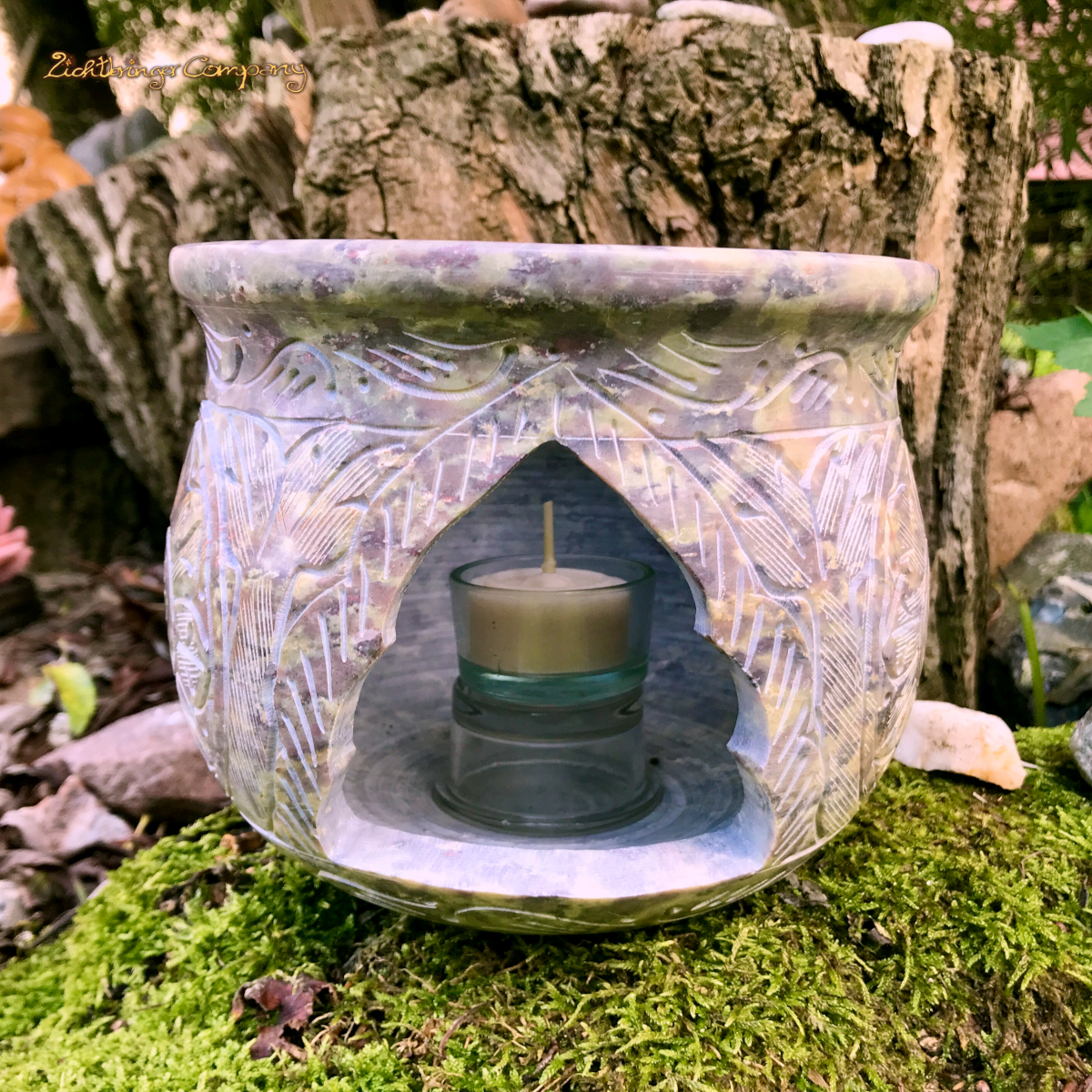 Das Stövchen aus natürlichem Speckstein ist fein graviert mit einer Sonnenblume. Die Öffnung für das Teelicht in Form einer orientalischen Tür erinnert im Lichterschein an ein indisches Tempelchen.