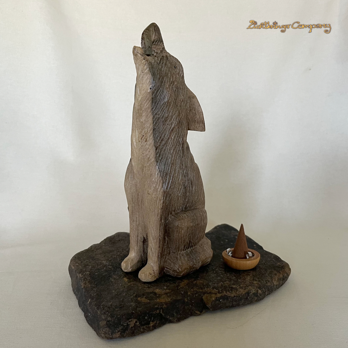 Ein heulender Wolf, der räuchern kann: Dieser Wolf ist etwas ganz Besonderes! Geschnitzt aus natürlichem Suar-Holz, ist jeder Wolf einzigartig in Maserung und Herstellung. Unten hat die Holzfigur eine Öffnung, in diese kannst du den mitgelieferten Teller für die Räucherkegel stellen. Sodann entsteigen dem heulenden Wolf mystische Rauchwolken :) Das riecht gut und sieht echt mystisch aus. Verbinde dich mit der Wolfskraft!