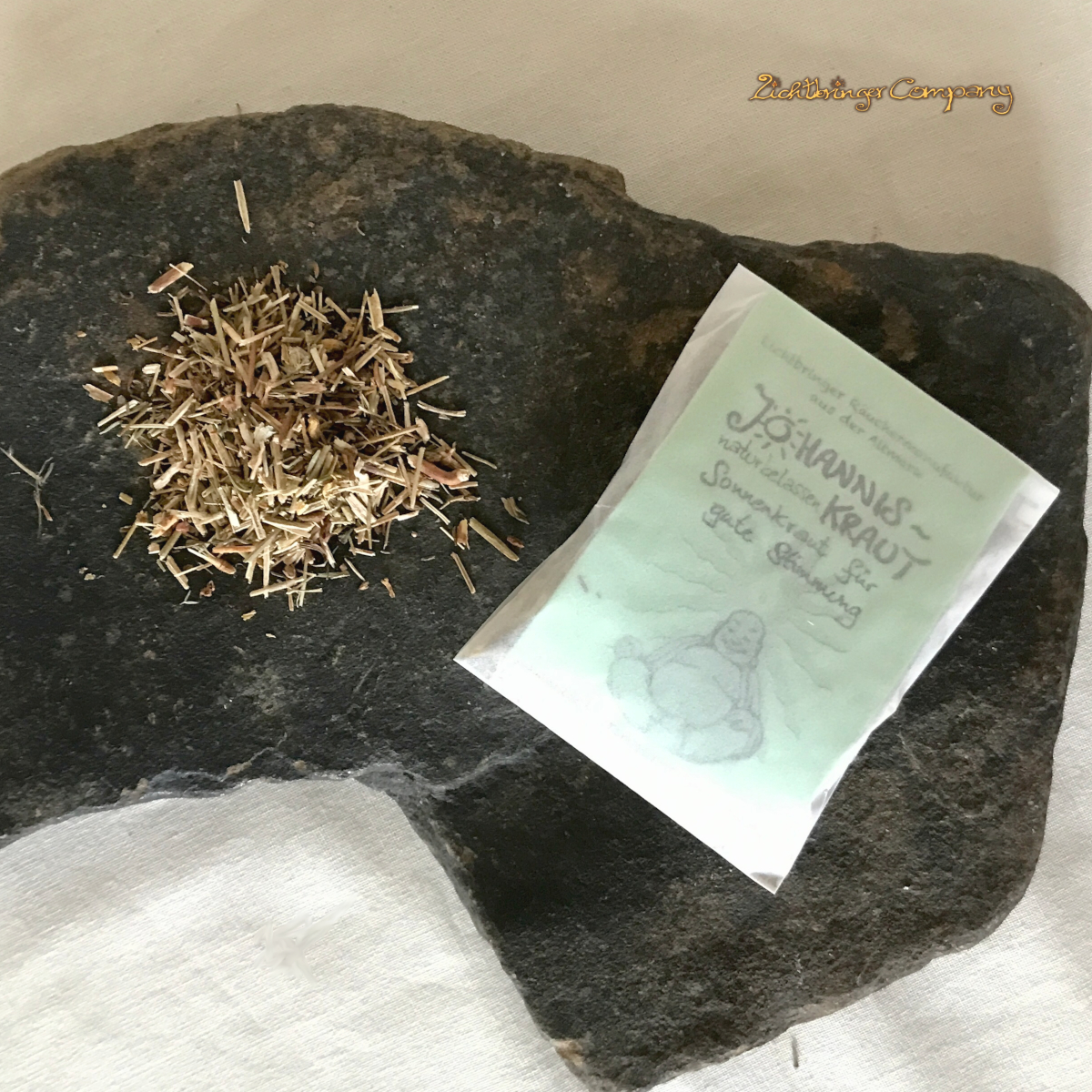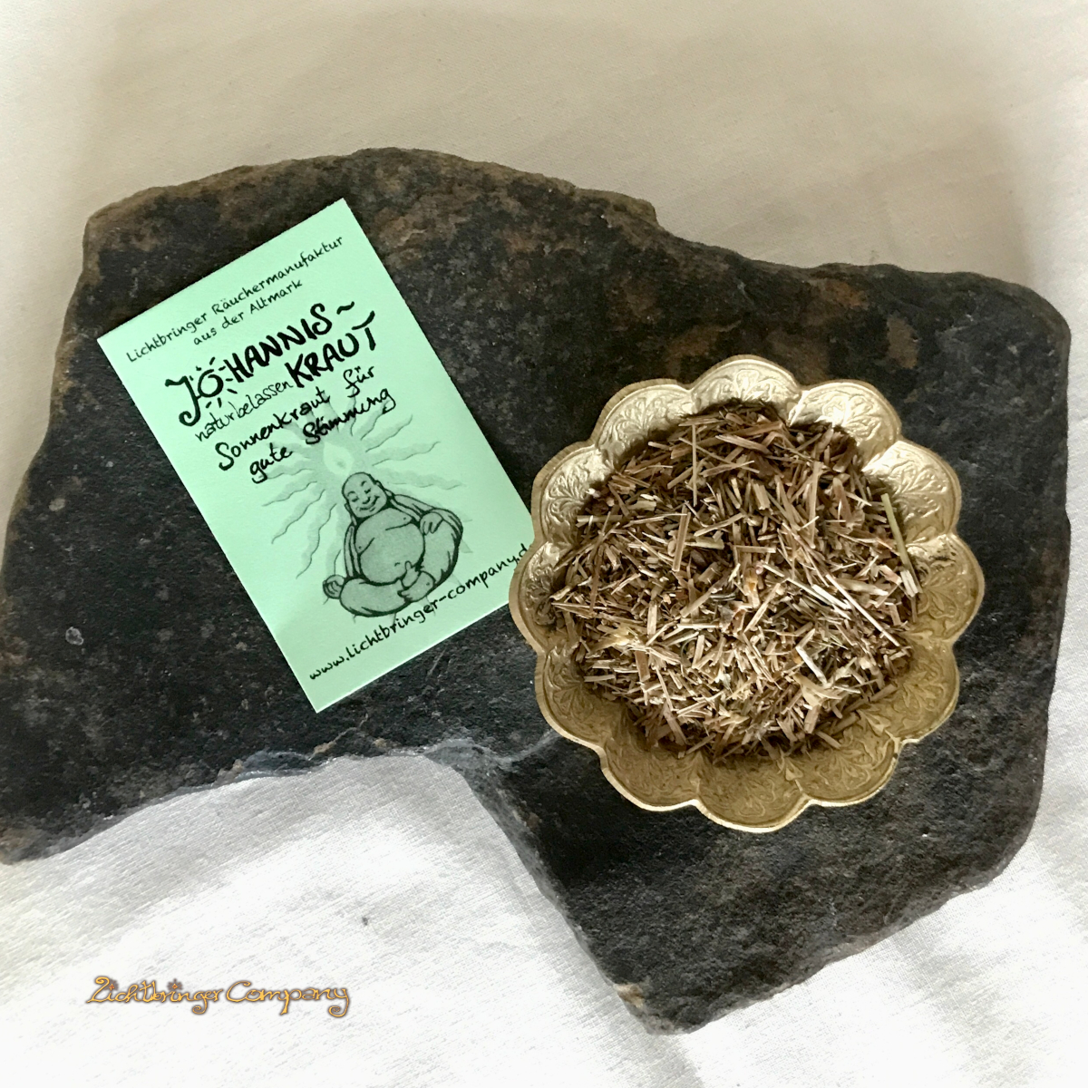 Johanniskraut, das in der Zeit der Sommersonnwende überall blüht und leuchtet, steht mit seiner sonnig strahlenden Blütenkraft für die lichten Kräfte des Universums, gilt seit Urzeiten als Wetterkraut mit spannungslösender Kraft bei elektrischen und emotionalen Stimmungen, ist eines der traditionellen Sonnwendkräuter. Dieses Kraut mit eher sanftem Eigenduft bereichert Mischungen mit starker Lichtkraft, das eignet sich für alles, wo positive Impulse gebraucht, das Leben gestärkt werden soll. Für Schutz und Vertrauen, zum Trösten und atmosphärischen Reinigen. Und, von alters her, zum Bannen von bösen Geistern und Dämonen :)